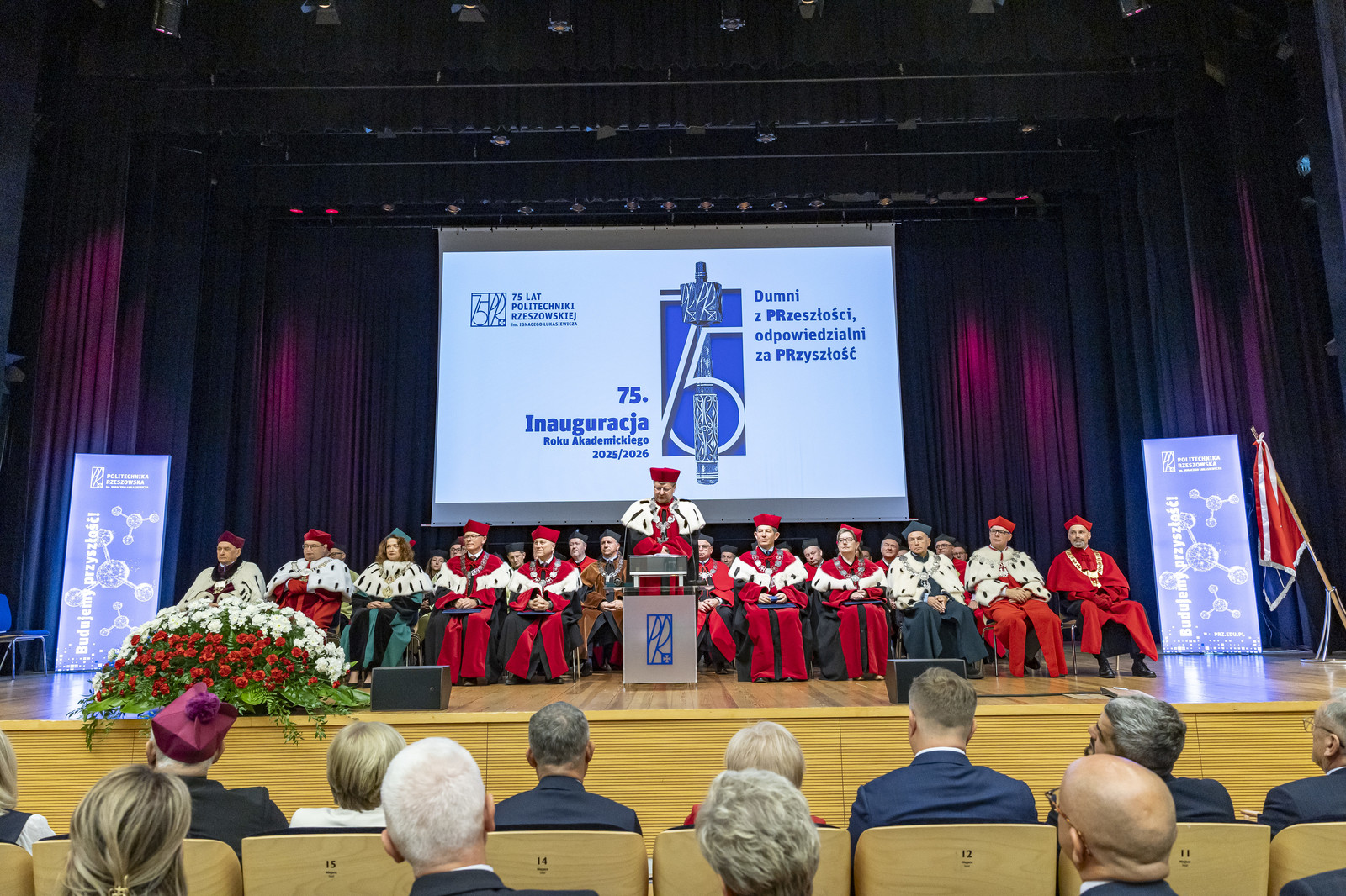 „Inauguracja roku akademickiego to nie tylko uroczystość, to także moment refleksji nad tym, czym jest uczelnia, kim jesteśmy jako jej członkowie i dokąd zmierzamy. W świecie pełnym niepewności uczelnia pozostaje jednym z ostatnich bastionów racjonalności, otwartości i dialogu. To nasza odpowiedzialność – chronić te wartości i przekazywać je kolejnym pokoleniom” – mówił rektor prof. Piotr Koszelnik podczas przemówienia inaugurującego jubileuszowy 75. rok akademicki na Politechnice Rzeszowskiej.