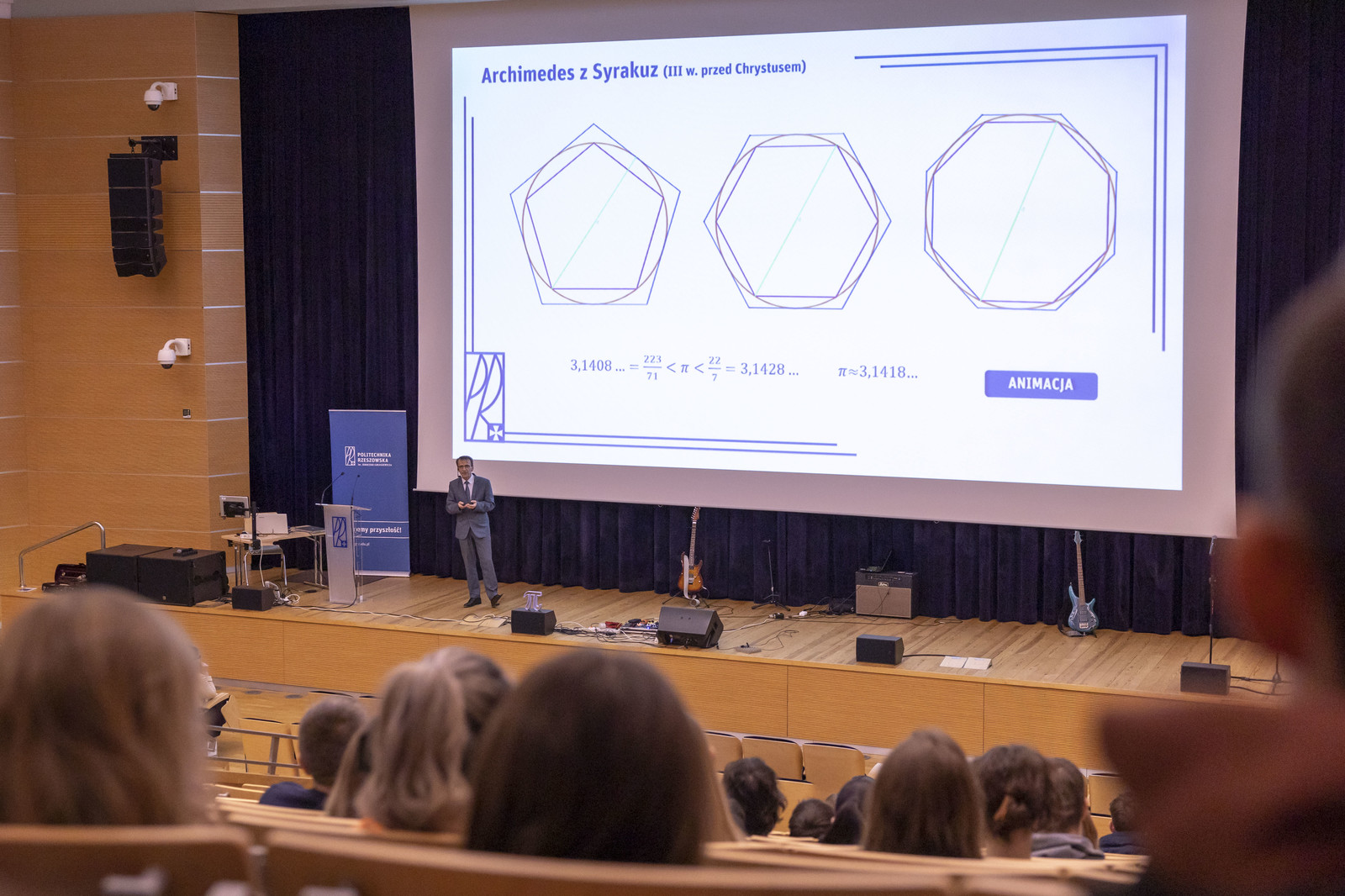 Wykład inauguracyjny pt. „Stała Archimedesa, czyli podziwu godna liczba π” zaprezentował dr Krzysztof Piejko. Jedną z ciekawostek przytoczonych podczas wykładu była informacja dotycząca jednego ze sławnych miłośników liczby Pi matematyka Ludolpha van Ceulen, który żył na przełomie XVI i XVII w. Na obliczaniu kolejnych cyfr rozwinięcia liczby Pi spędził on niemal całe życie. Wynikiem jego pracy jest pierwsze 35 cyfr rozwinięcia liczby Pi, które umieszczono na jego nagrobku. Na pamiątkę fascynacji tego matematyka liczbę Pi nazywa się czasem „ludolfiną”. Obecnie znanych jest ponad 60 bilionów pierwszych miejsc po przecinku liczby Pi.