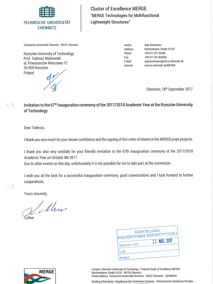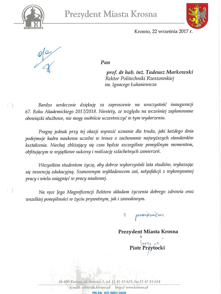 Ponad 30 listów gratulacyjnych z życzeniami sukcesów i dalszego rozwoju otrzymała Politechnika Rzeszowska z okazji rozpoczęcia nowego roku akademickiego. Ich autorami są przedstawiciele najwyższych władz państwowych, parlamentarzyści, duchowni i samorządowcy. Listy gratulacyjne dotarły także z różnych ośrodków naukowych z całej Polski.
