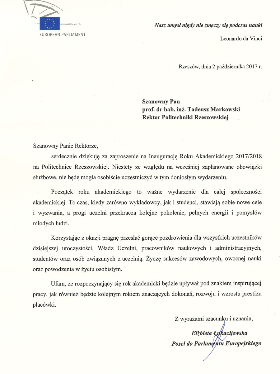 List przesłał także Marek Kuchciński, marszałek Sejmu RP. Ma on nadzieję, że kolejne lata będą owocowały rozwojem, pomnażaniem naukowego dorobku oraz rosnącym prestiżem Politechniki Rzeszowskiej. - Władzom uczelni, profesorom i wykładowcom gorąco życzę powodzenia w urzeczywistnianiu zawodowych aspiracji oraz wielu naukowych, badawczych i dydaktycznych sukcesów. Studentom zaś przeżycia wielkiej intelektualnej przygody i dobrych wyników, a przede wszystkim płynącej z nich satysfakcji - podkreślił marszałek Sejmu.