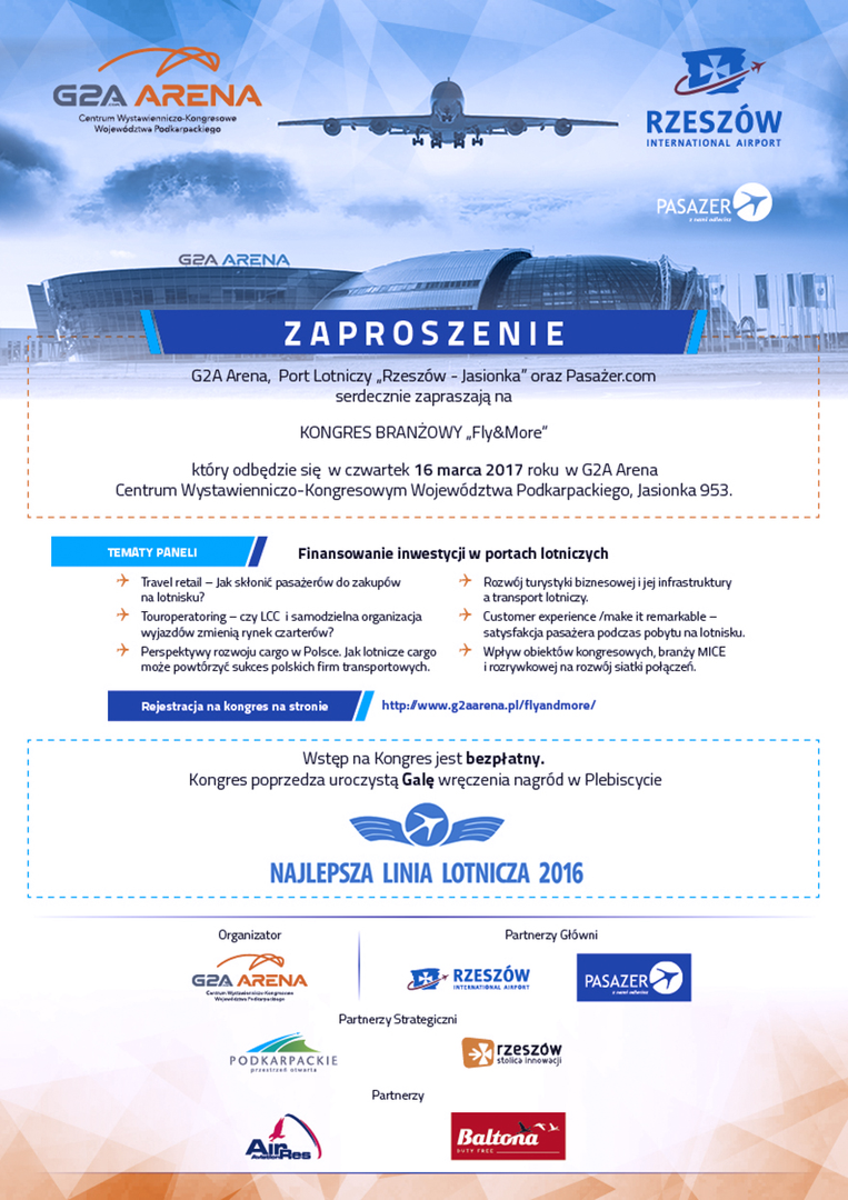 Program kongresu jest dostępny na stronie: http://www.g2aarena.pl/flyandmore/. Kongres „Fly & More” poprzedza galę wręczenia nagród w plebiscycie Najlepsza Linia Lotnicza 2016. Organizatorzy zapewniają bezpłatny wstęp, a rejestracji można dokonać do 13 marca br. Serdecznie zapraszamy do wzięcia udziału w wydarzeniu.