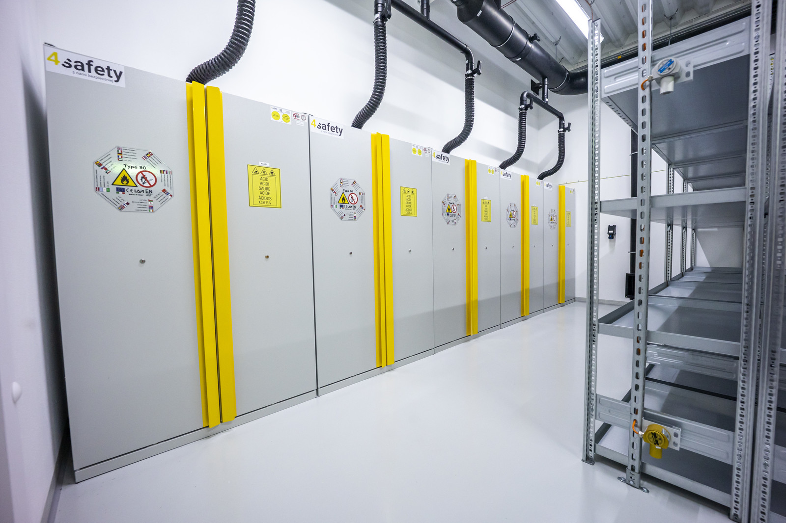 Dużą uwagę poświęcono także wyposażeniu magazynowemu. W obiekcie zastosowano specjalistyczne szafy na odczynniki chemiczne, w tym szafy na substancje łatwopalne i żrące oraz szafy przystosowane do składowania beczek o dużej pojemności. Wysoka odporność ogniowa oraz systemy wentylacji i zabezpieczeń znacząco ograniczają ryzyko pożaru, wycieku czy niekontrolowanych reakcji chemicznych. Uzupełnieniem wyposażenia są wanny wychwytowe, regały z półkami wannowymi oraz specjalistyczne chłodziarki laboratoryjne, umożliwiające bezpieczne przechowywanie substancji o różnych właściwościach fizykochemicznych.